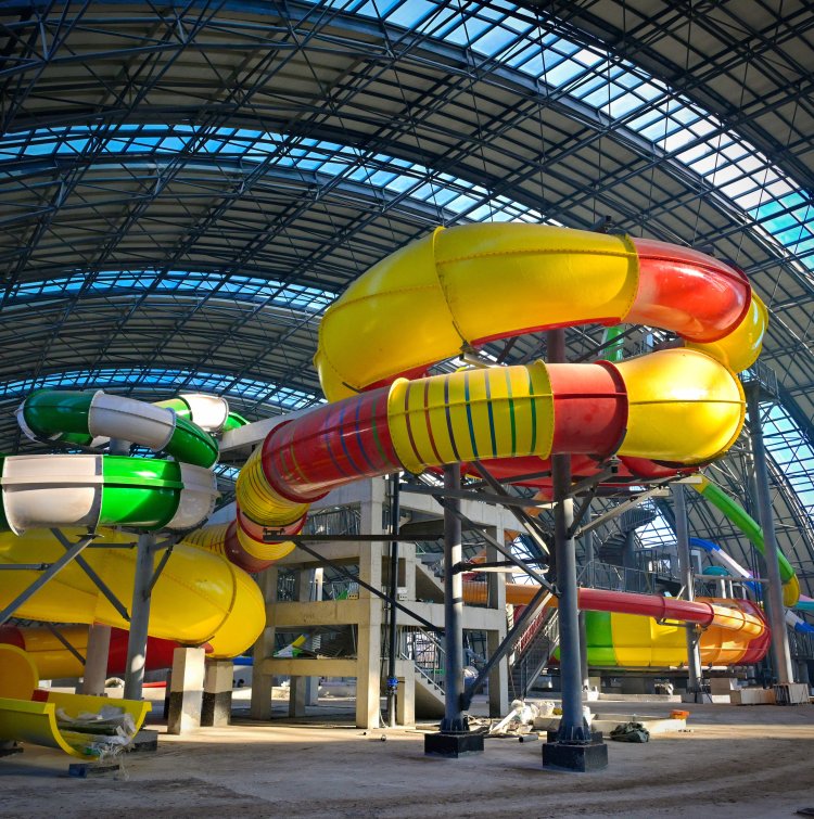 Қазіргі уақытта құрылыс жұмыстарының 75 пайызы аяқталған. Нысанда су аттракциондарын орнату жүргізіліп жатыр, кейін ішкі әрлеу жұмыстары басталады. Жобаны 2026 жылдың бірінші жартысының соңына дейін аяқтау көзделген.