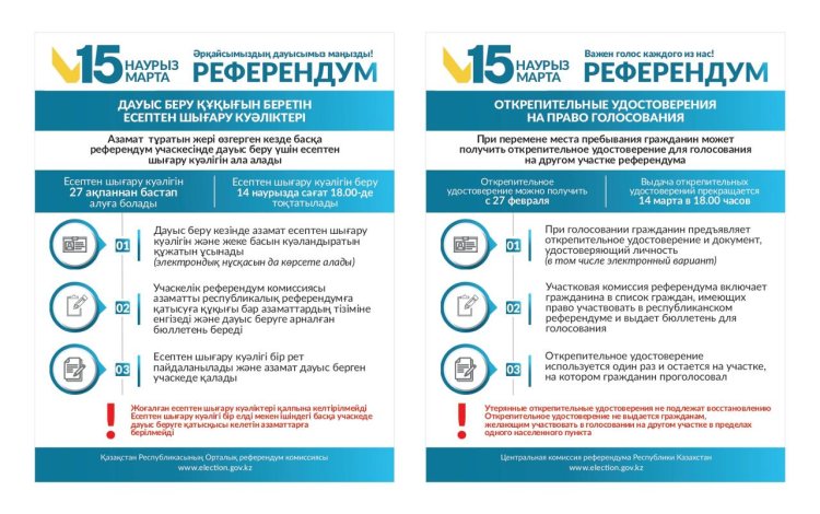 - 14 наурыз күні сағат 18:00-ге дейін Сіз өзіңіздің учаскелік комиссияңызға жазбаша өтінішпен жүгініп, жеке басыңызды куәландыратын құжатты ұсынуыңыз қажет. Комиссия сізге есептен шығару куәлігін табыс етедi, - делінген хабарламада.