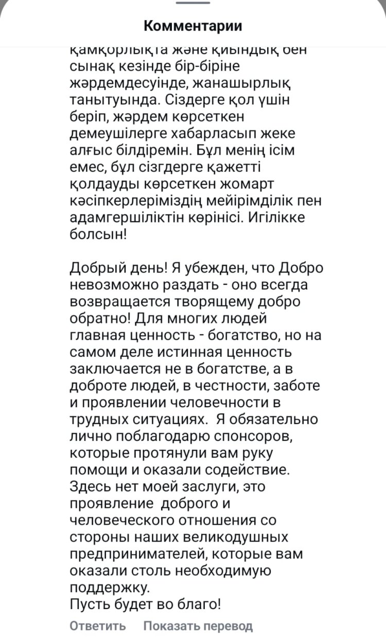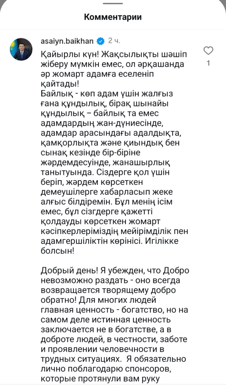 Асаин Байханов выразил уверенность, что истинная ценность заключается не в богатстве, а в доброте людей, в честности, заботе и проявлении человечности в трудных ситуациях.