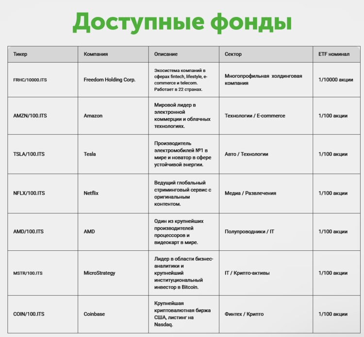 На казахстанском рынке появился новый инструмент для инвесторов – Single-Stock ETF, дробные биржевые фонды на отдельные акции мировых компаний. Это первая в Казахстане подобная инициатива. Теперь можно покупать доли акций таких брендов, как Amazon, Tesla или Netflix, не целиком, а частями – вплоть до сотых и даже десятитысячных. Такой формат упрощает доступ к дорогостоящим бумагам и помогает собрать более разнообразный портфель даже с небольшими вложениями.