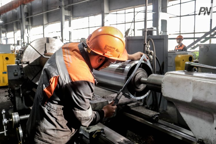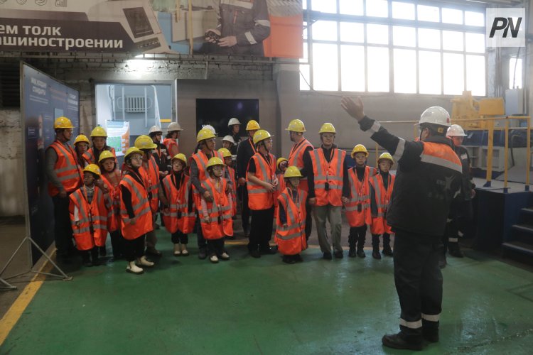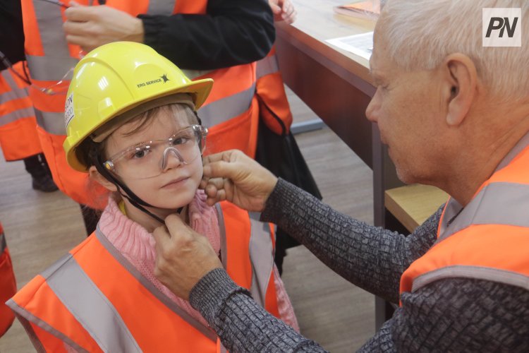 Маленьких гостей одели в оранжевые жилеты и жёлтые каски, рассказали про безопасность и охрану труда, и в сопровождении взрослых они отправились в увлекательное путешествие по цехам Павлодарского машиностроительного завода.