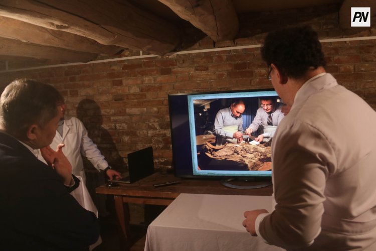 В цокольном этаже, где располагается хранилище объектов минералогии, палеонтологии и археологии, гостям продемонстрировали интересные находки древних захоронений. Способ извлечение погребенных – грунтовым блоком – и сканирование блоков томографом сформировало новое направление – археологическая томография.