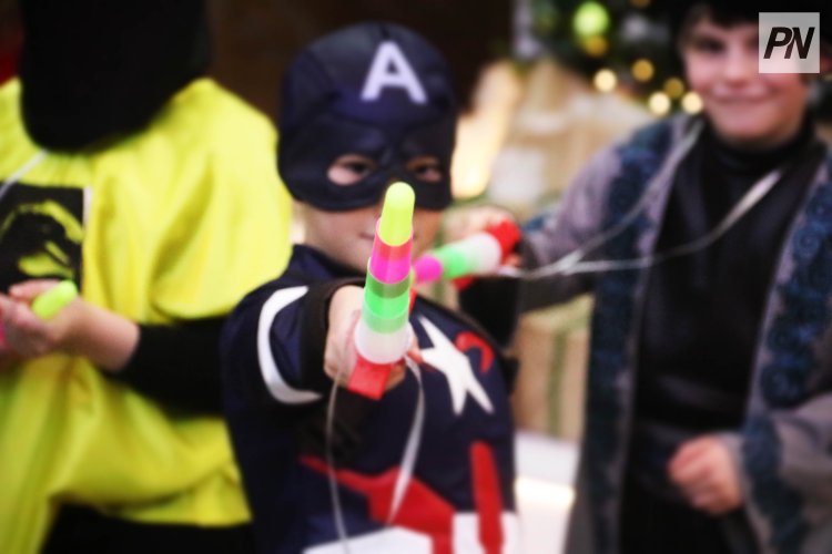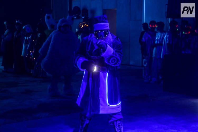 Даже Аяз-ата предстал перед детьми в сияющем неоновом одеянии, гармонично вписавшись в высокотехнологичную концепцию праздника.