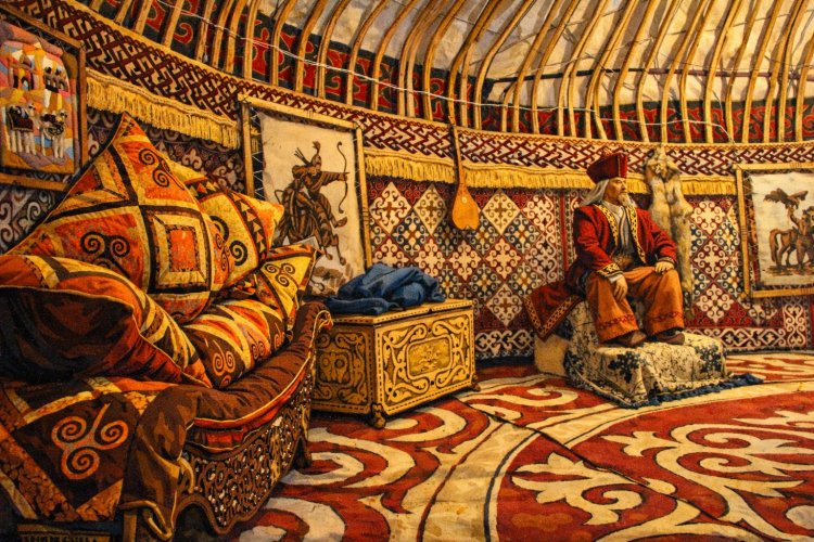 В самом низу – узоры, похожие на волны. Выше идёт так называемый «травяной стиль»: стилизованные тюльпаны, трава, растительные мотивы. Ещё выше появляются зооморфные элементы изображения животных, а в самой верхней части, у основания шанырака, располагается особый орнамент – космогонический. Это образ мироздания, когда-то вложенный человеком в форму и знак.