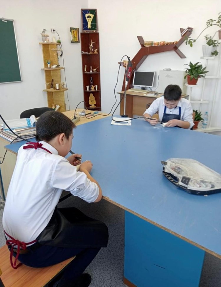 Здесь учитель труда Есенкельды Бакеев открыл кружок «Сырлы сүйек», где ребята учатся работать с костью.