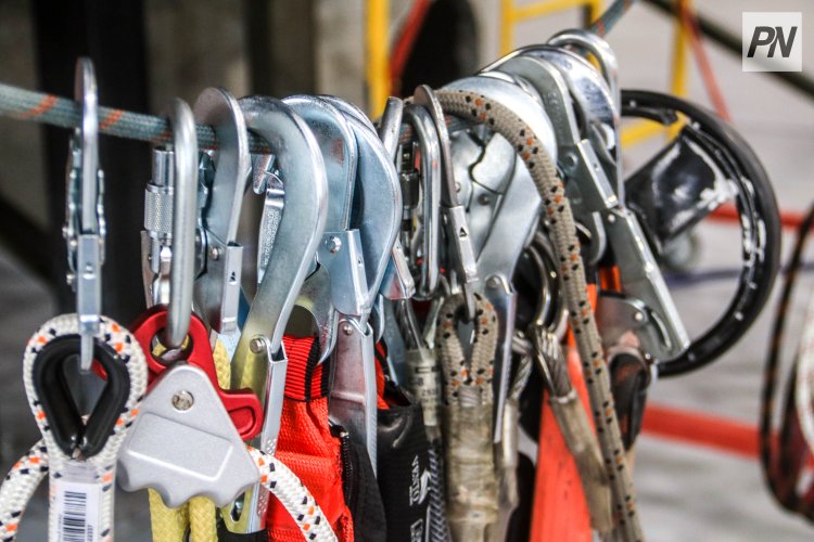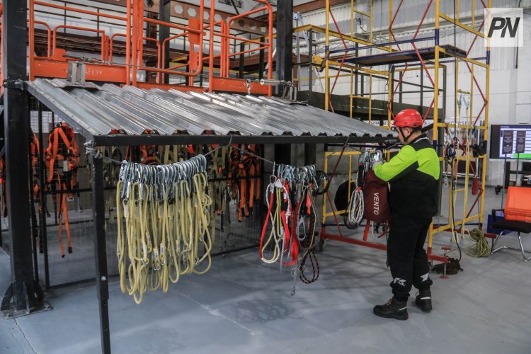 Стенд для высотников оборудован подъёмными конструкциями, крепёжными приспособлениями, карабинами и натяжными ремнями, что позволяет безопасно отрабатывать реальные рабочие сценарии.