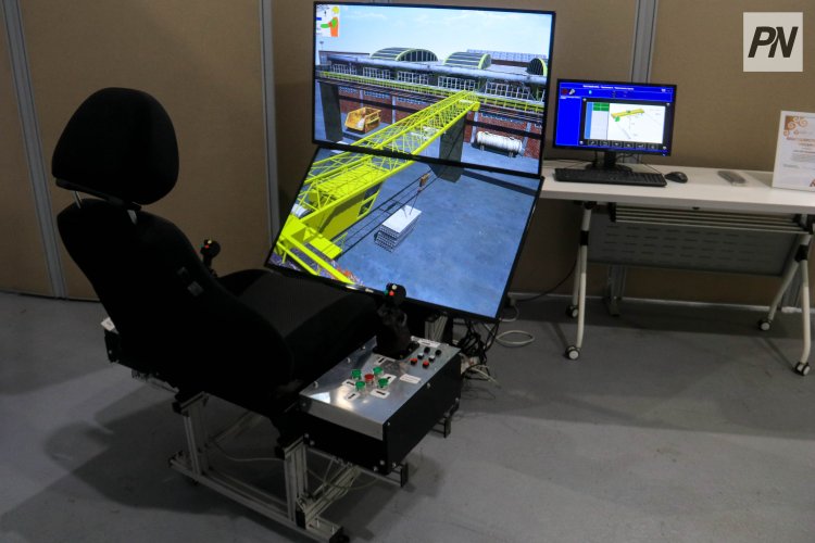 Подход к подготовке – изящный и серьёзный одновременно. На тренажёре машиниста крана установлены кресло и пульт управления в натуральную величину, а огромный экран имитирует полный обзор из кабины.