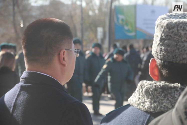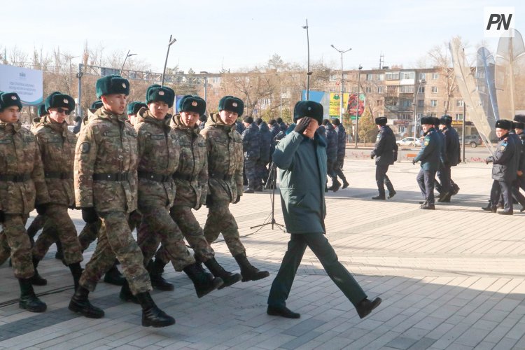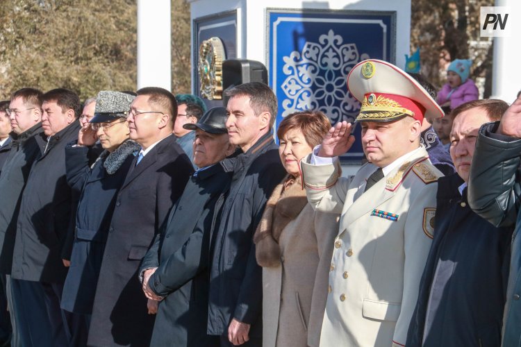 Аким Павлодарской области Асаин Байханов дал официальный старт церемонии, объявив о поднятии Флага под звуки государственного Гимна. Военные и сотрудники правоохранительных органов прошли торжественным маршем перед руководителями ведомств, города и области.